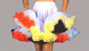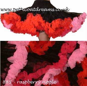 Above is the 845 - a 50 yard chiffon petticoat with 3 layers of soft, soft chiffon, shown in raspberry. Right is the 885, a 35 yard petticoat with multicoloured fluff trimming, again in the softest chiffon shown in raspberry ripple colours.